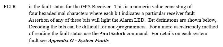 Ex: FLTR 0200 FLTS 0A80 GPS Antenna Fault, Secondary PS Fault