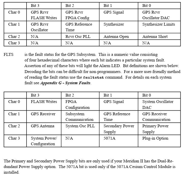 Ex: FLTR 0200 FLTS 0A80 GPS Antenna Fault, Secondary PS Fault