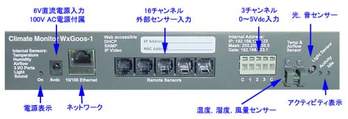 温度,湿度,照度(光量),風量,音の5つのセンサーを内蔵し,16個のインテリジェント外部センサーと,3つのアナログセンサーを接続できるます.サーバールームやラック内部,実験室,温室,鶏舎や倉庫などの遠隔環境監視をコンパクトなモジュールが簡単に実現します.ウェブカメラと組み合わせて,画像による監視も可能.スーパーグースは液晶表示と警報ブザーを内蔵. |