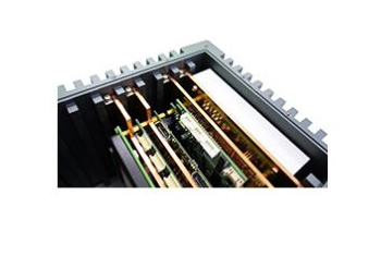 システム内部の銅製ヒート・スプレッダーは熱源となるモジュールに密着するように設置されています。CPUやチップセットから発生した熱は、銅製ヒート・シンクからwedge-lokを通して、アルミヒート・シンク型の筐体へ効果的に素早く伝達されます。